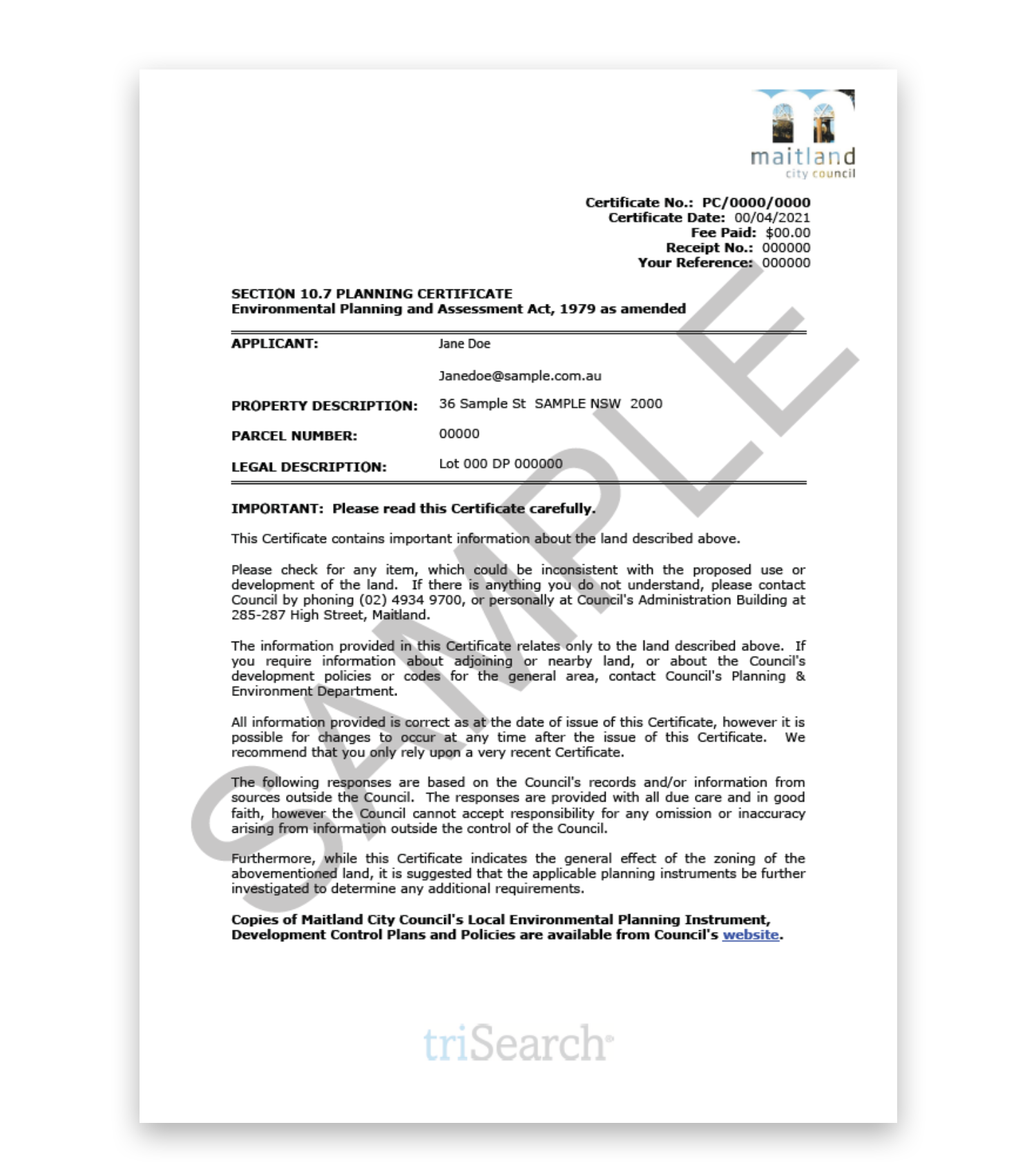 A Section 10.7 Planning Certificate (formerly Section 149) outlines the development potential of a property. There are 2 types of Section 10.7 Planning Certificates.