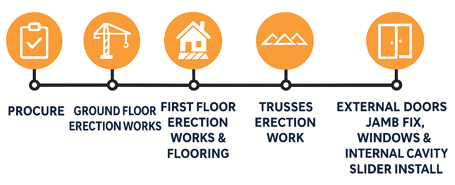 | Ground Floor Erection Works | Works This is when the builders put together and stand up the timber frame for the ground floor of your house. It’s the first big step in building your home’s structure. |