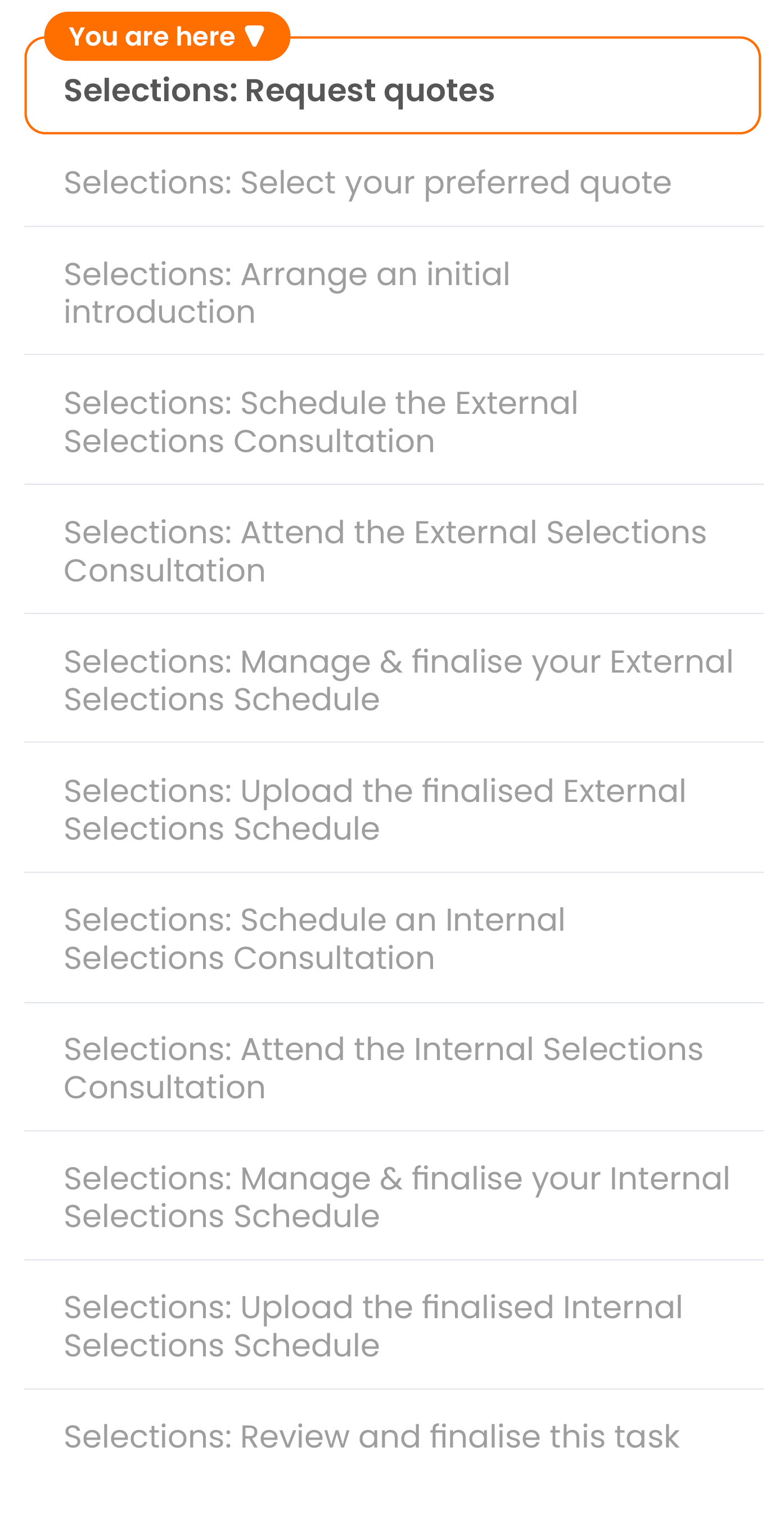 You’ll unlock access to your External Selections tab before internals — that’s because many external finishes need to be decided before final engineering and approval documents can be completed.