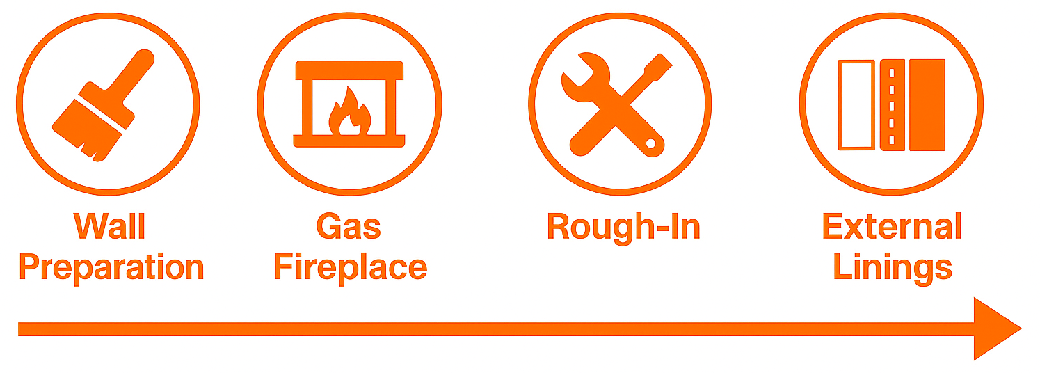 Order your fireplace early — flue kits often take longer to arrive than the fireplace itself, and you can’t rough-in gas without them.