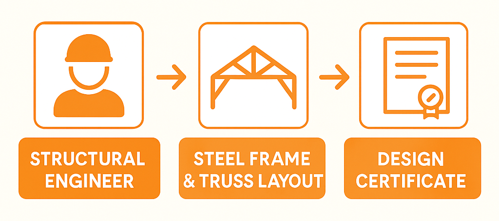 A Structural Engineer is a certified professional who assesses and approves structural elements of a build — ensuring they meet strength, safety, and compliance standards. For this task, they’re engaged to review and certify the layout and design of your steel frame and roof trusses.