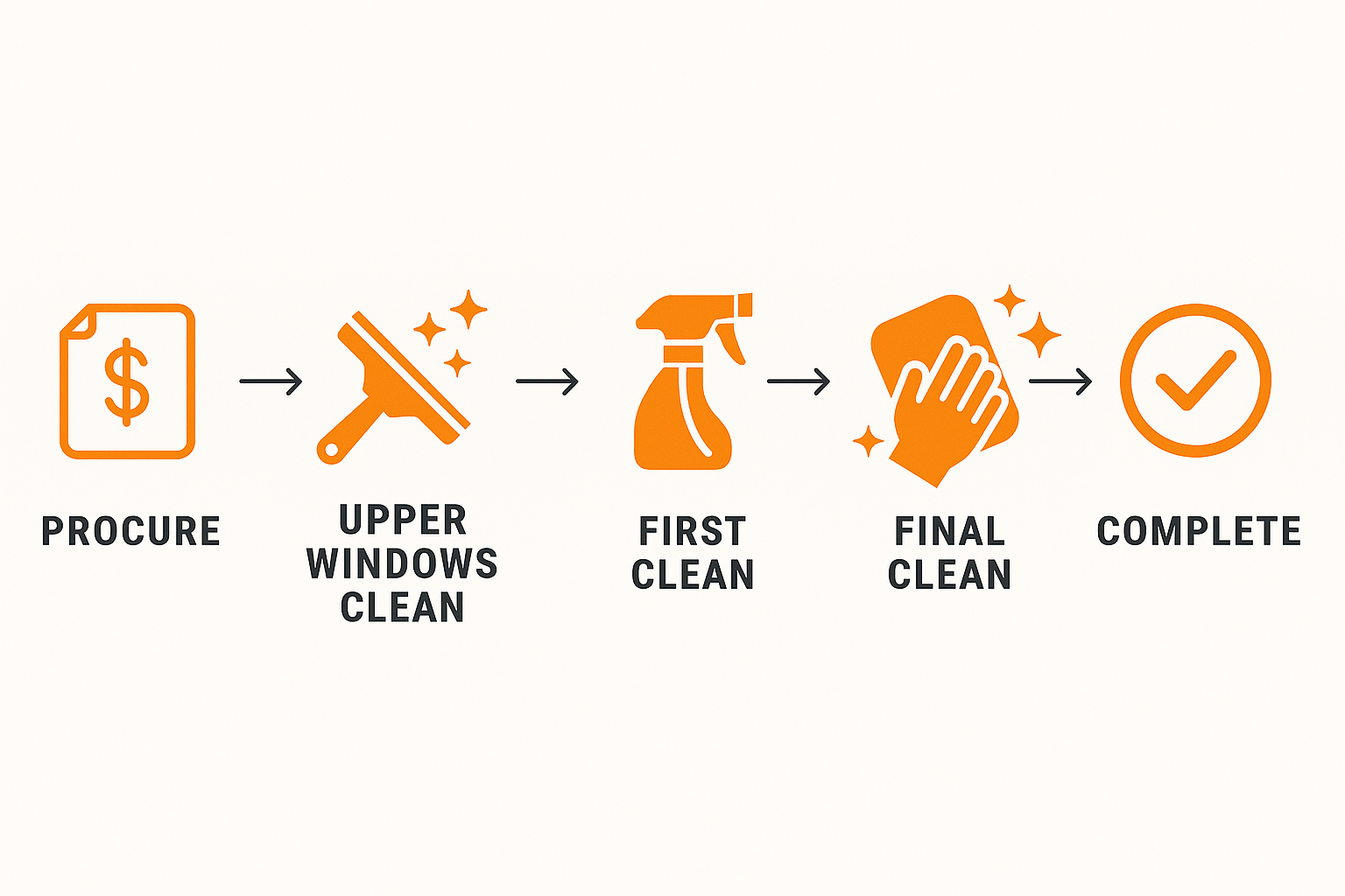 Always ask for two cleans — a rough clean (after fit-off) and a final presentation clean before handover. One big clean at the end can be rushed and miss hidden dust or paint splatters.