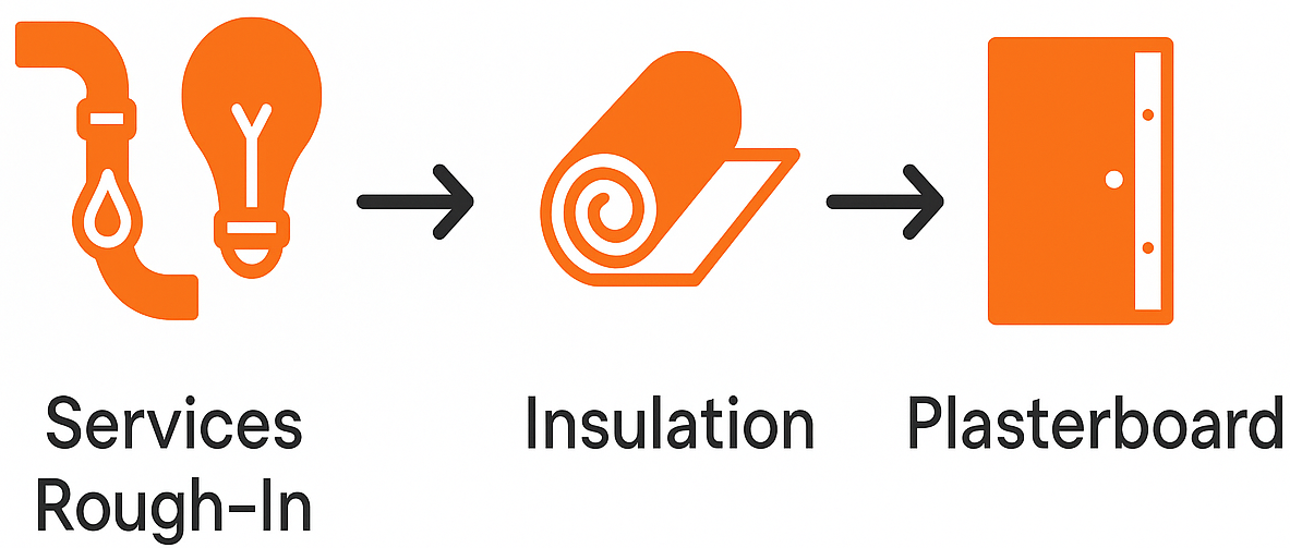Insulation is installed after framing and services rough-in, but before plasterboard is installed.