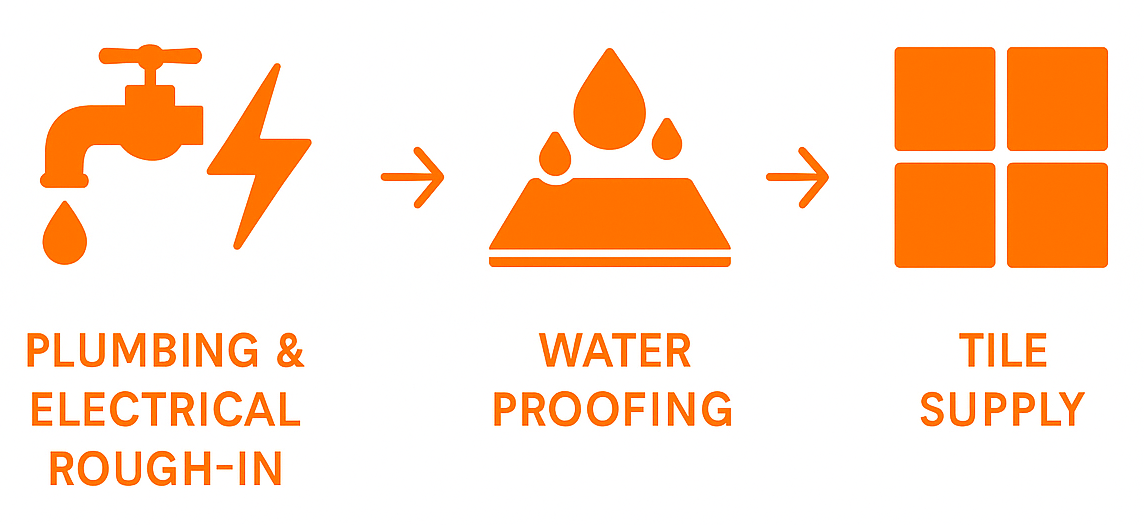 Tile supply must be finalised before tiling begins, and ideally confirmed early enough to inform waterproofing setdowns, screeds, and cabinetry clearances.